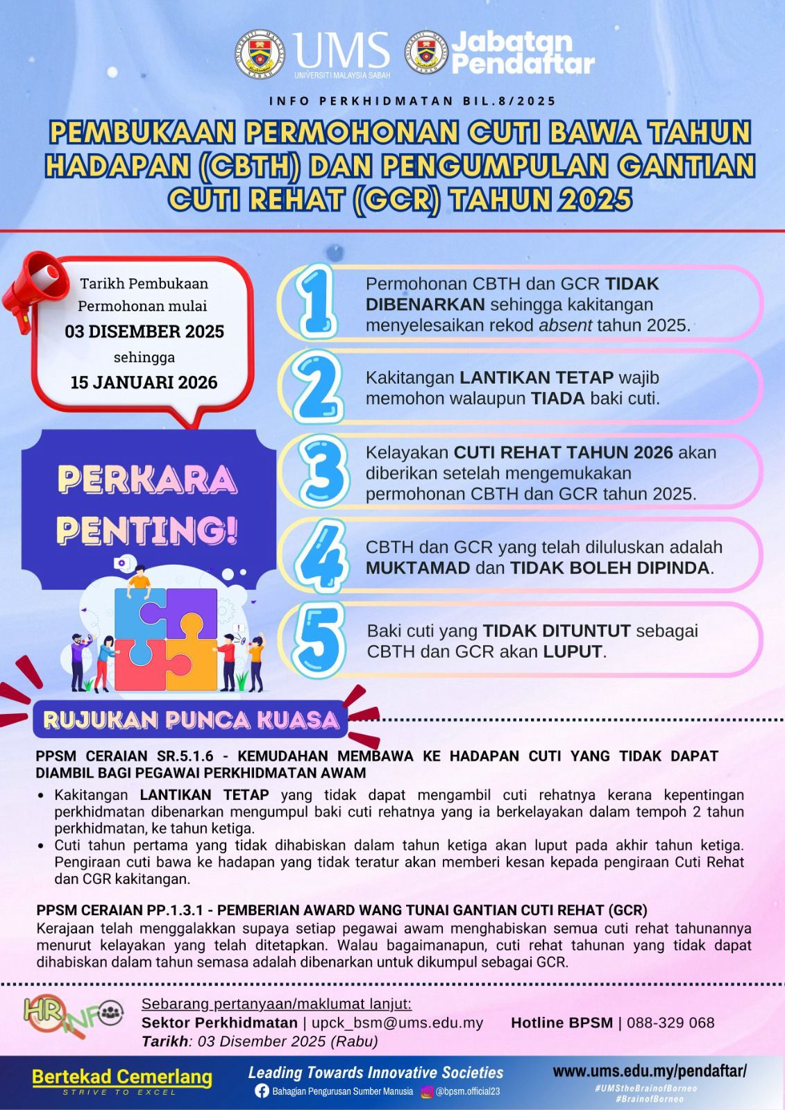 Sukacita dimaklumkan bahawa borang e-LNPT akademik dan pentadbiran bagi tahun penilaian 2025 telah dibuka bermula 9 April 2025. Semua kakitangan akademik dan pentadbiran adalah digalakkan untuk membuat pengisian borang e-LNPT tahun penilaian 2025 secara berkala dan berperingkat sebelum 31 Disember 2025 untuk mengelakkan bebanan mengisi pada saat akhir.