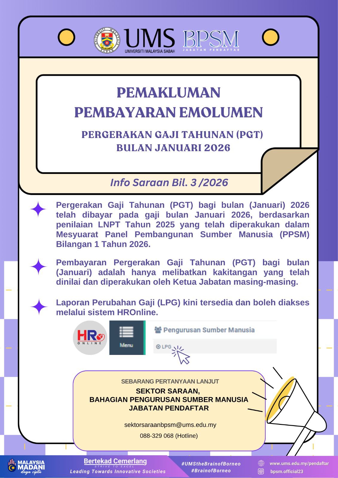Makluman pembayaran emolumen Pergerakan Gaji Tahunan (PGT) untuk kakitangan UMS